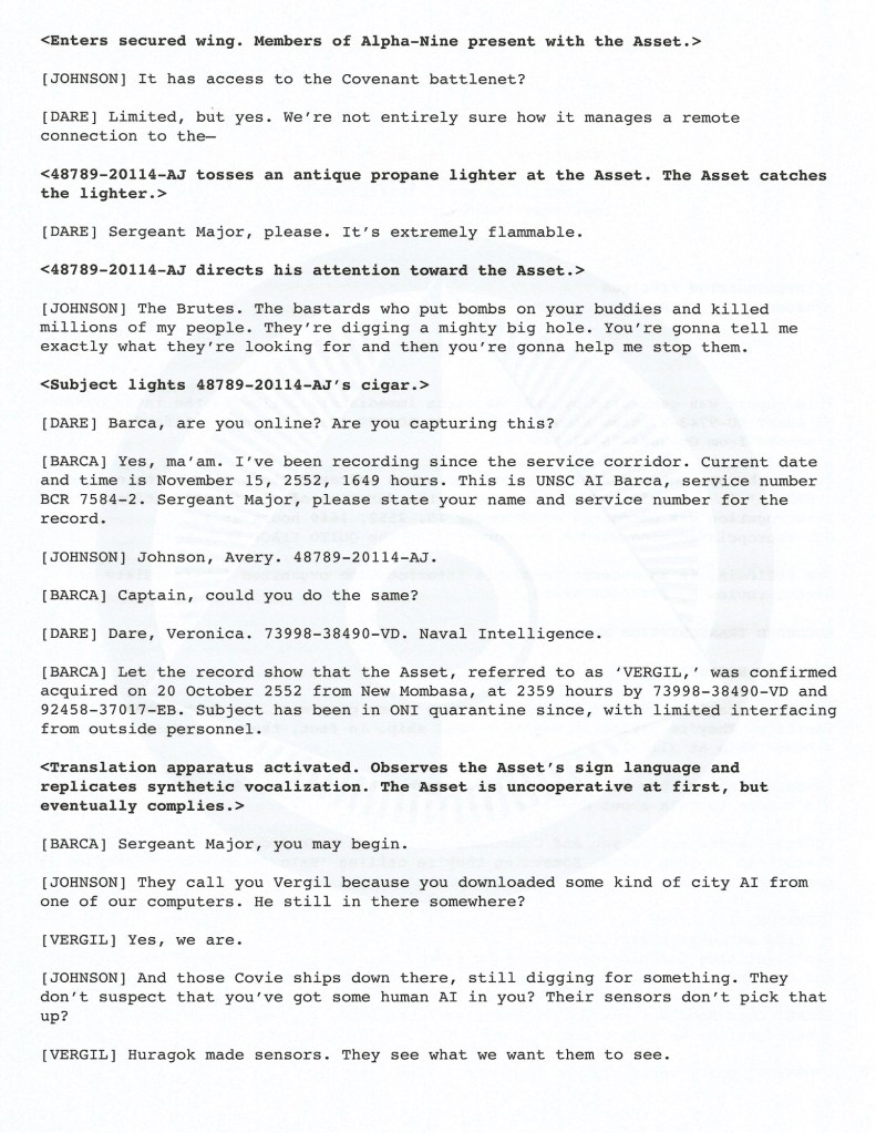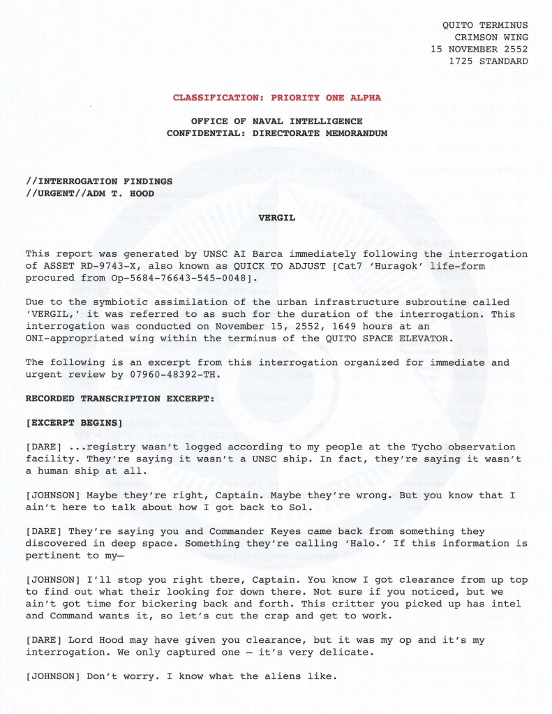 Summary: Sergeant Avery Johnson joins Veronica Dare’s interrogation of the Huragok named Vergil/Quick to Adjust.