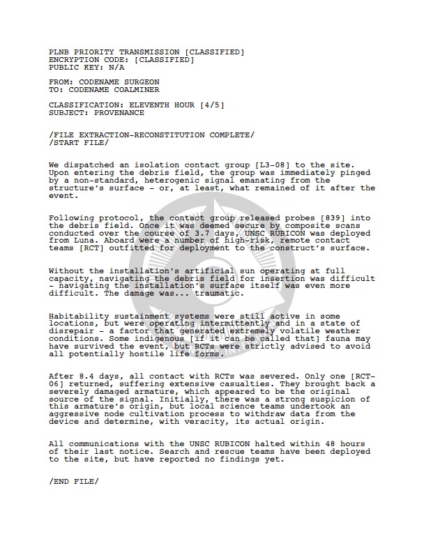 The secondary storyline of Halo: Primordium, which works as a narrative framing device for the main storyline, is set on the UNSC Rubicon and follows an ONI science team who have recovered a damaged Forerunner monitor from The Ark (Installation 00) following the events of Halo 3. As they interrogate the monitor over the course of a few days, hoping to learn more about the Didact, the monitor attempts to hack into the UNSC Rubicon’s systems and take control of the vessel.